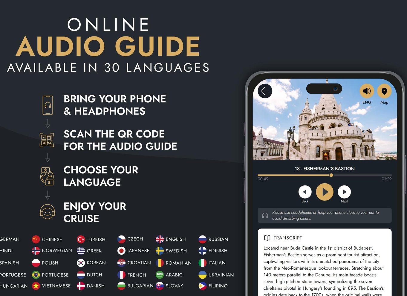 Take fantastic photos of Budapest's beautiful panorama while enjoying drinks from the stylish onboard bar with table service. Explore the landmarks with the help of the online audio guide, designed for use on your own phone and available in 30 languages.